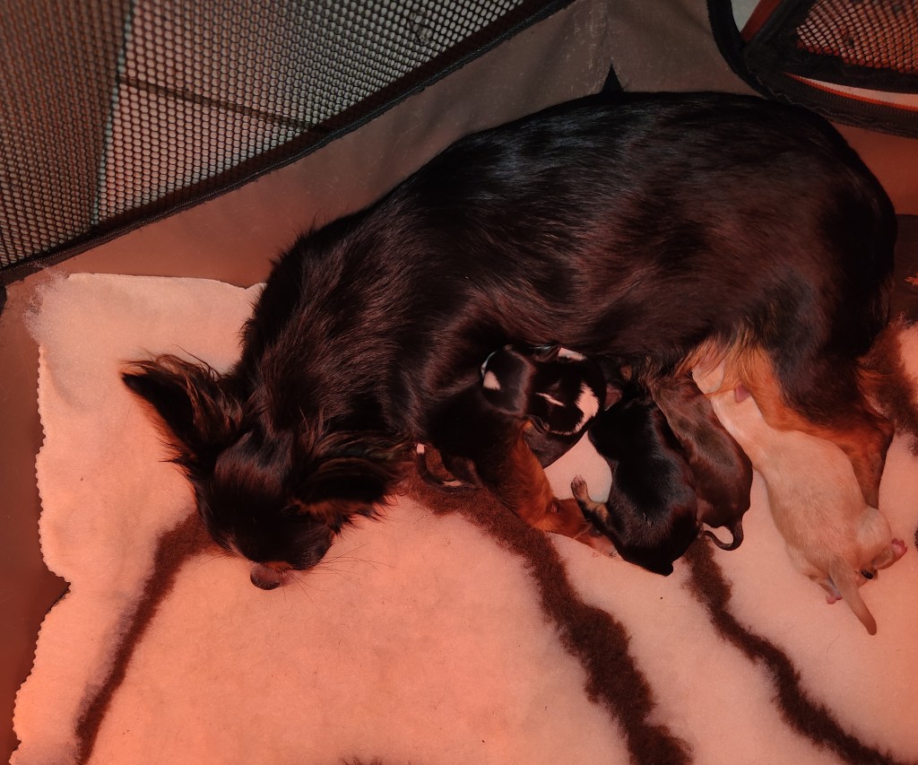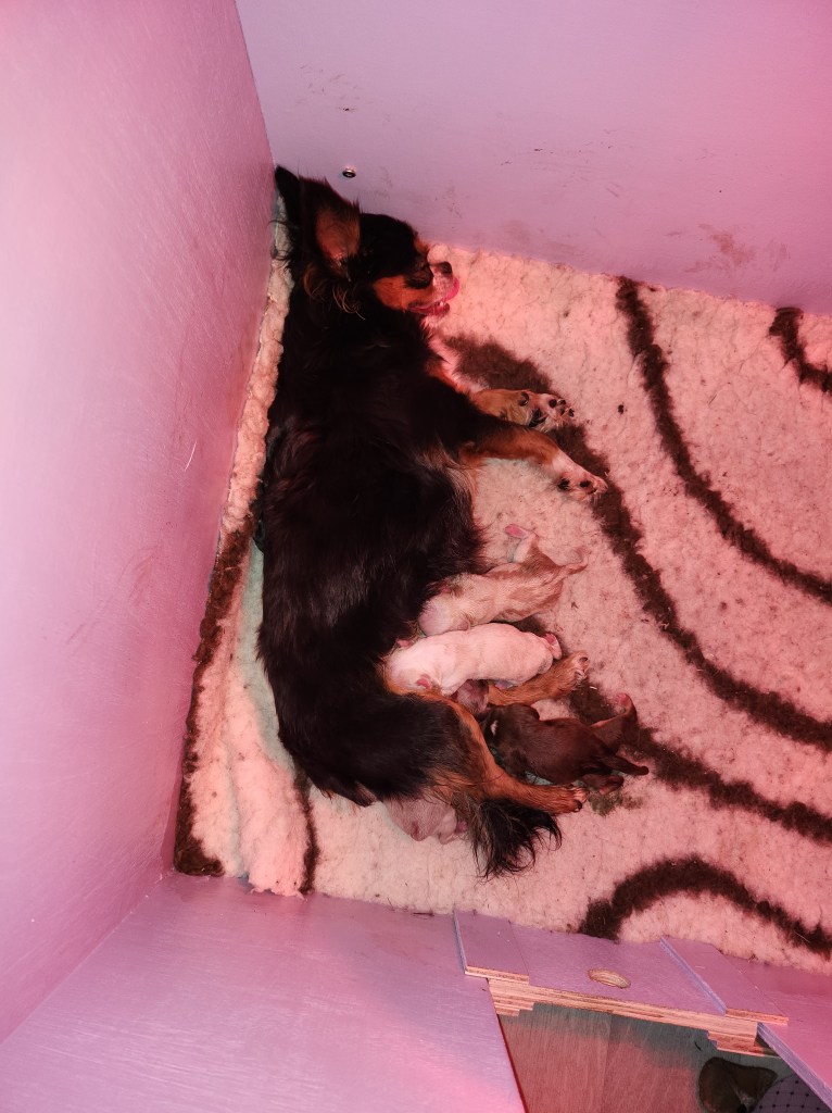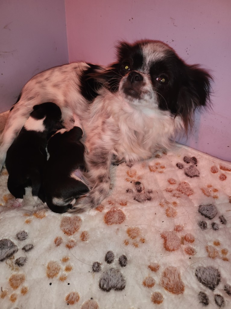 Accouchement de ma jolie Satine le 09.04.24. Accouchement par voie naturelle qui à bien commencé le premier chiot est sorti rapidement mais malheureusement le 2eme a mi trop de temps et est mort née…mais heureusement les autres sont sorties sans problème!!! Ma jolie Satine a mis au monde du coup deux belles femelles et deux beaux mâles.