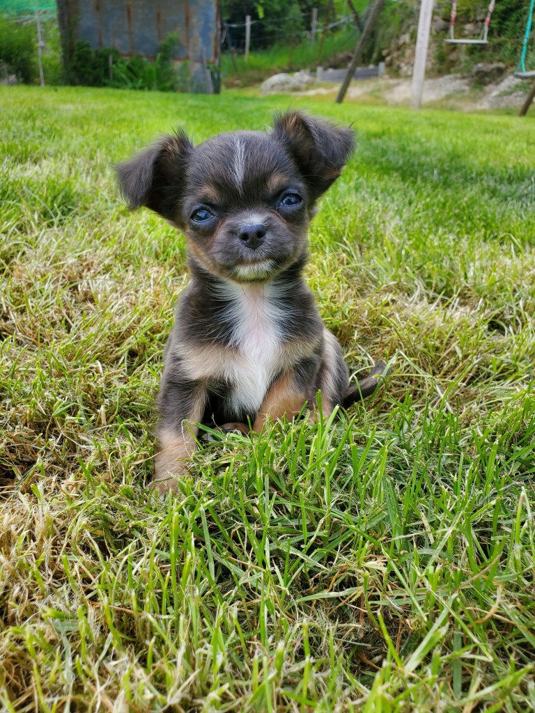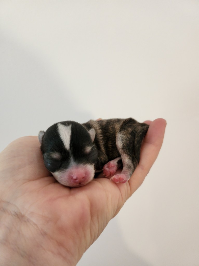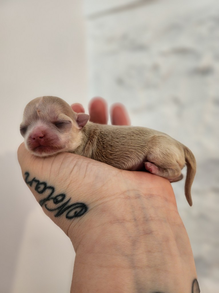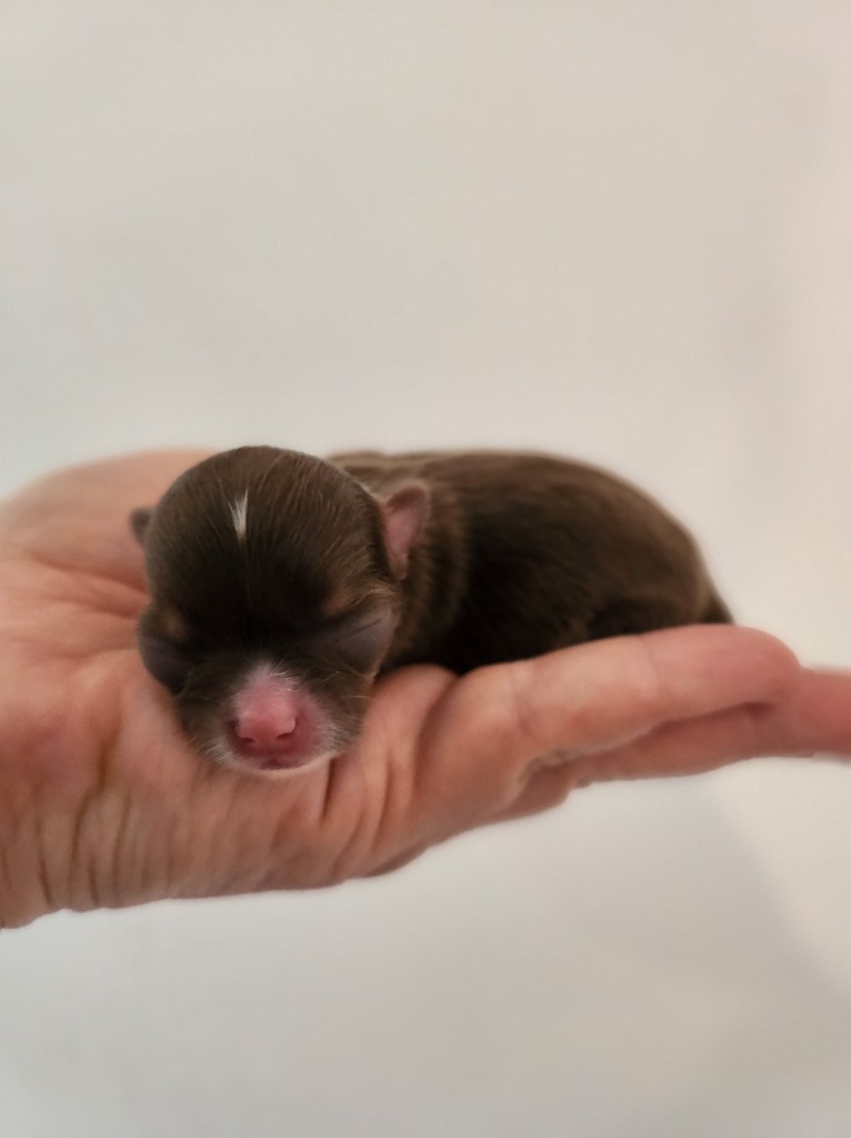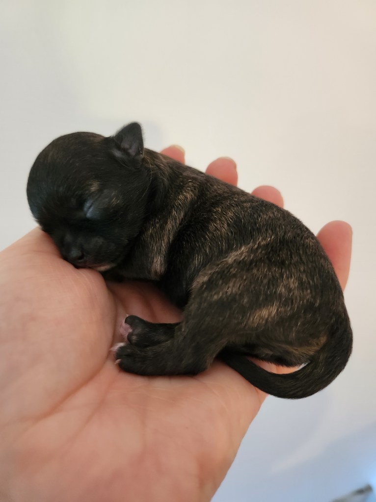 Son poids faramineux de 165g à la naissance (c’est ÉNORME pour un chihuahua…lol) explique pourquoi elle est restée coincée.