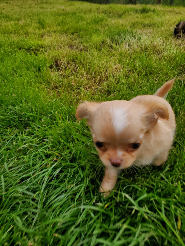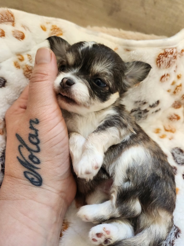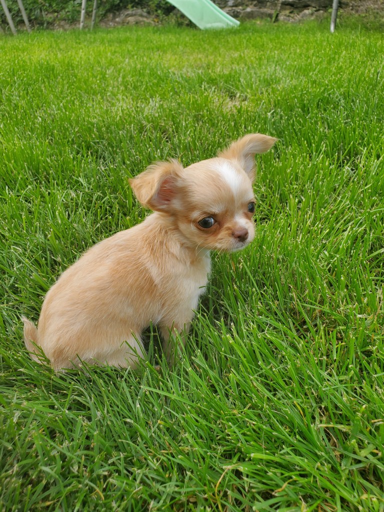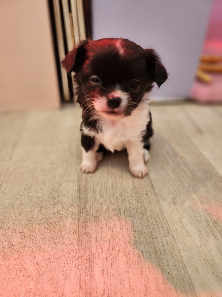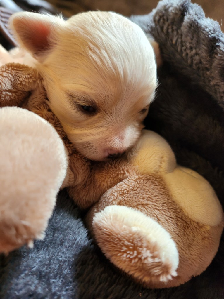 Son poids faramineux de 165g à la naissance (c’est ÉNORME pour un chihuahua…lol) explique pourquoi elle est restée coincée.